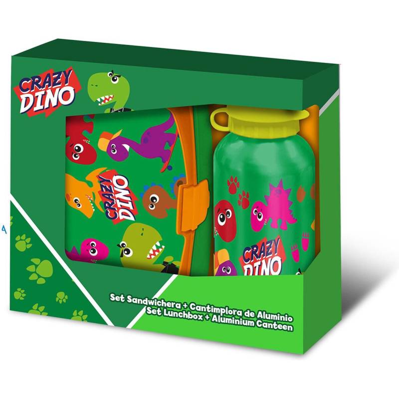 Setul include o cutie de prânz de înalta calitate și o sticlă de băut din aluminiu, care este imprimată cu personaje emblematice precum Crazy Dino.