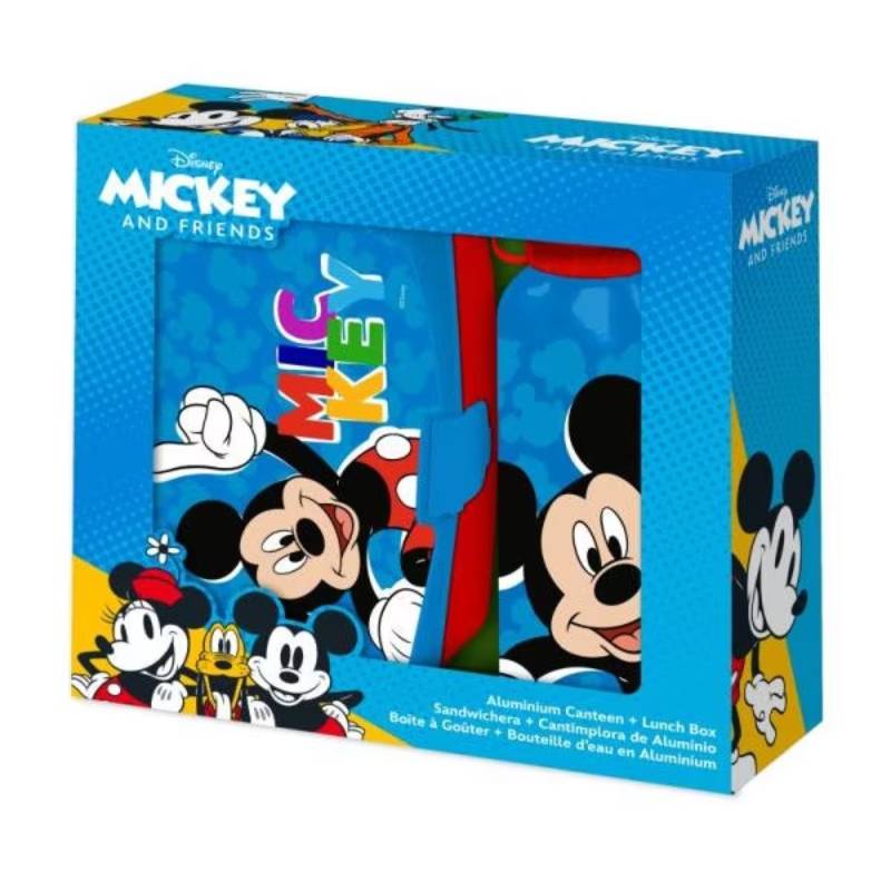 Setul include o cutie de prânz de înalta calitate și o sticlă de băut din aluminiu, care este imprimată cu personaje emblematice precum Mickey Mouse.