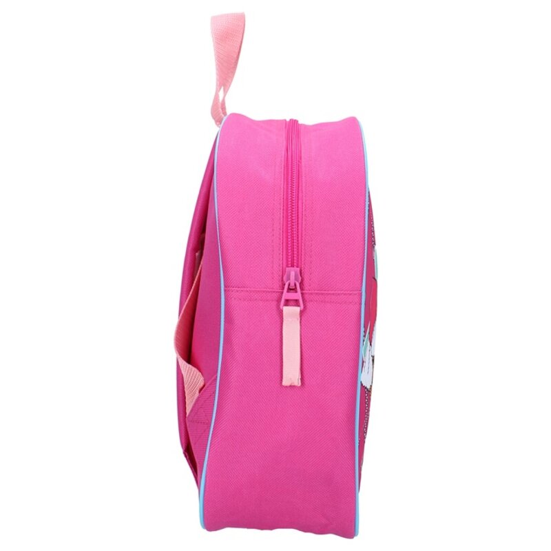 Geanta are un compartiment principal mare cu suficient spatiu pentru lucruri de scoală, echipament sportiv etc. Geanta se închide cu un fermoar. Geanta de culoare fucsia prezintă imagini vesele ale păpușilor L.O.L. Surprise.