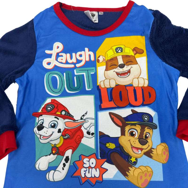 Designul atrăgător, de culoare albastră, este decorat cu personajele preferate – Chase, Marshall sau Rubble – gata să însoțească fiecare seară cu zâmbete și voie bună. Croiala cu mâneci lungi și pantalonii cu talie elastică oferă libertate de mișcare și confort maxim.