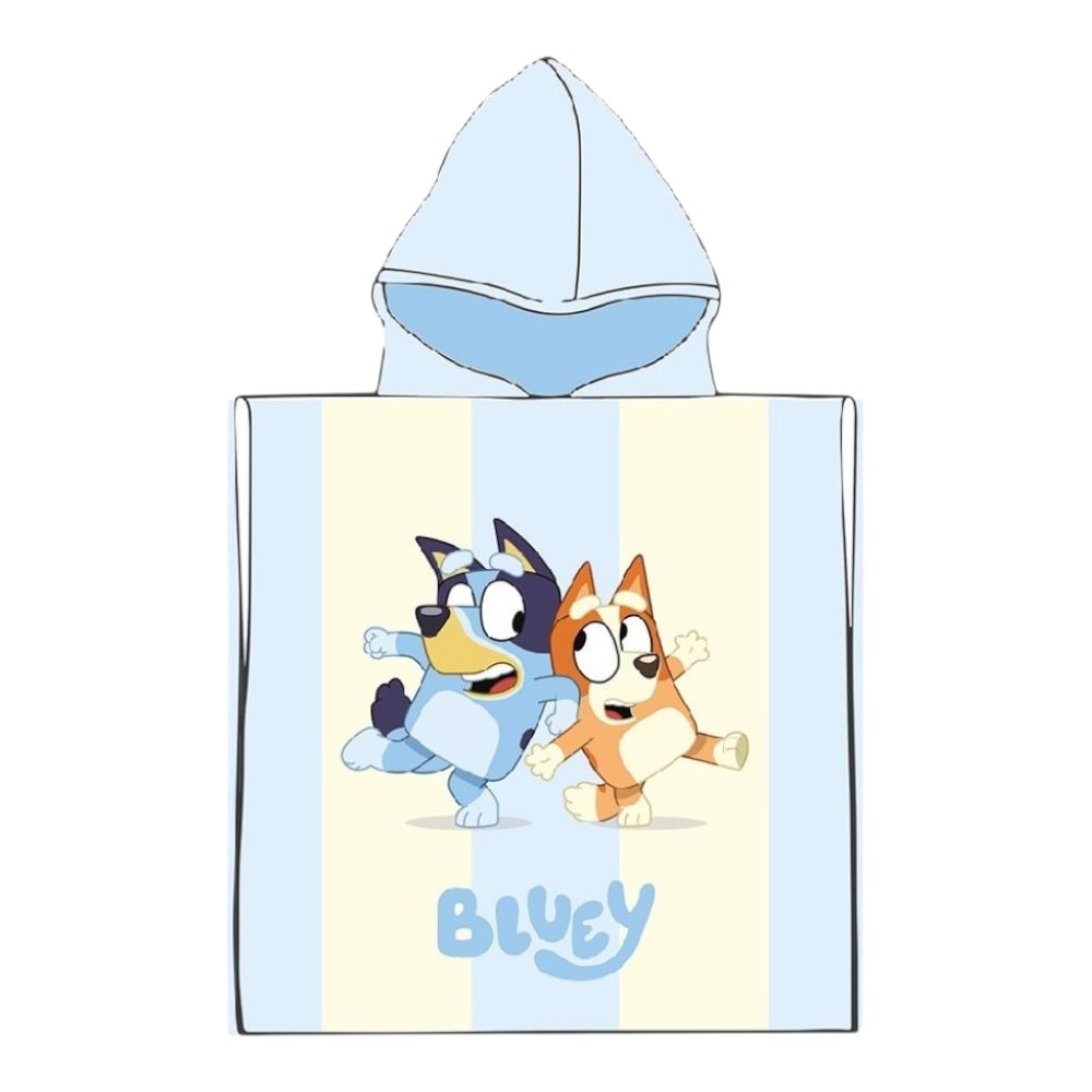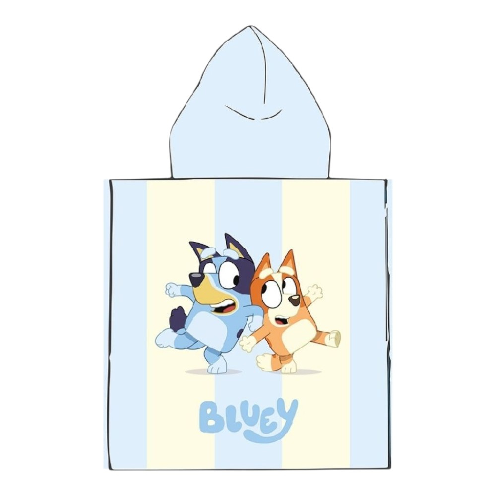 Prosop de baie pentru copii, tip poncho, cu dimensiunea de 55x110 cm, fabricat 100% din bumbac moale și absorbant. Decorat cu un model drăgălaș și colorat cu Bluey, este ideal pentru momentele de după baie, piscină sau plajă. Aspectul tip poncho oferă confort și acoperire, fiind ușor de utilizat și plăcut la atingere. Perfect pentru copiii care iubesc joaca și personajele lor îndrăgite.