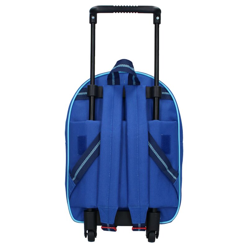 Detaliile de culoare albastru deschis și roșu completează acest rucsac tip troler. Poți depozita cu ușurință hainele, jucăriile și articolele de toaleta și poți lua rucsacul tip troler oriunde mergi. Datorită mânerului telescopic, fiecare copil poate trage ușor trolerul după el.